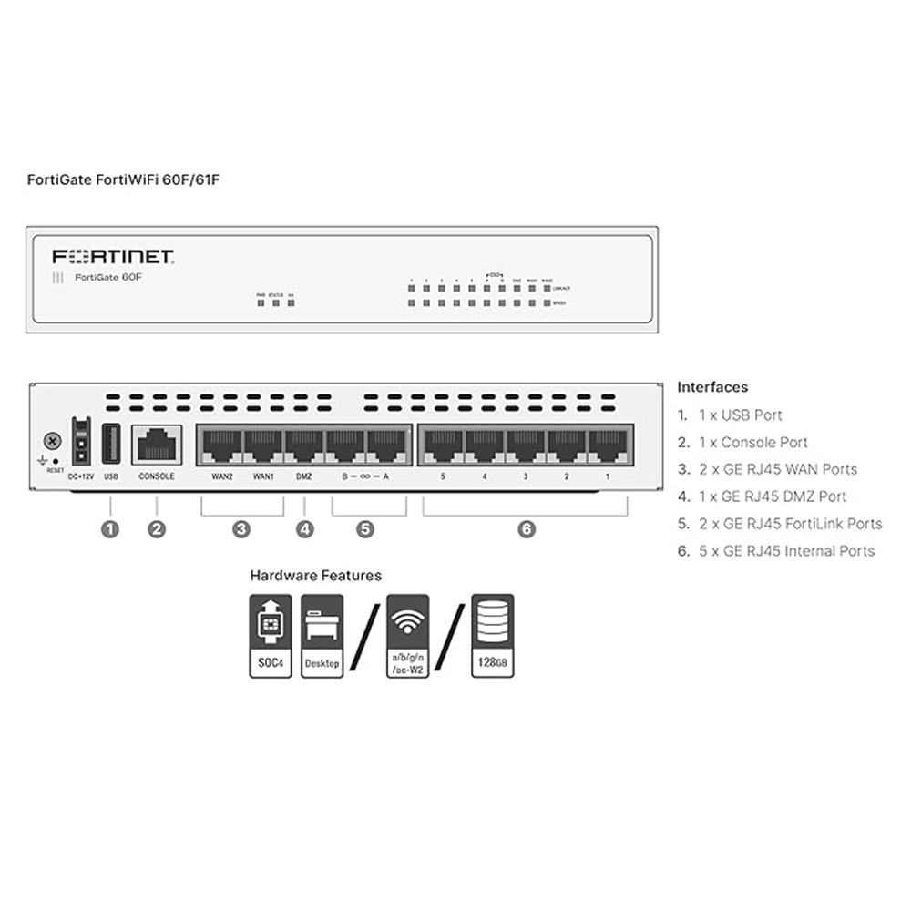 El FortiGate 60F es un firewall de próxima generación (NGFW) diseñado específicamente por Fortinet para pequeñas y medianas empresas (20-75 usuarios) . Su factor de forma de escritorio sin ventilador lo hace ideal para ubicaciones donde el espacio y el ruido son una preocupación.