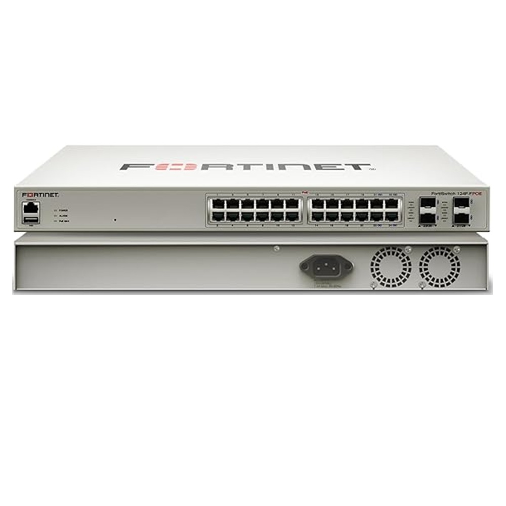El FortiSwitch FS-124F POE, es un switch gestionable de Capa 2 con 24 puertos PoE Gigabit Ethernet y 4 puertos SFP+ para enlaces de alta velocidad. Tiene 370 Watt para conexión de equipos que requieran energía a través del cableado, como teléfonos, cámaras, punto de acceso. Se integra con el Fortinet Security Fabric, permitiendo una gestión centralizada a través de FortiGate y una mayor seguridad. Es ideal para empresas que necesitan conectividad de alta velocidad y control granular del tráfico de datos. Tiene capacidad